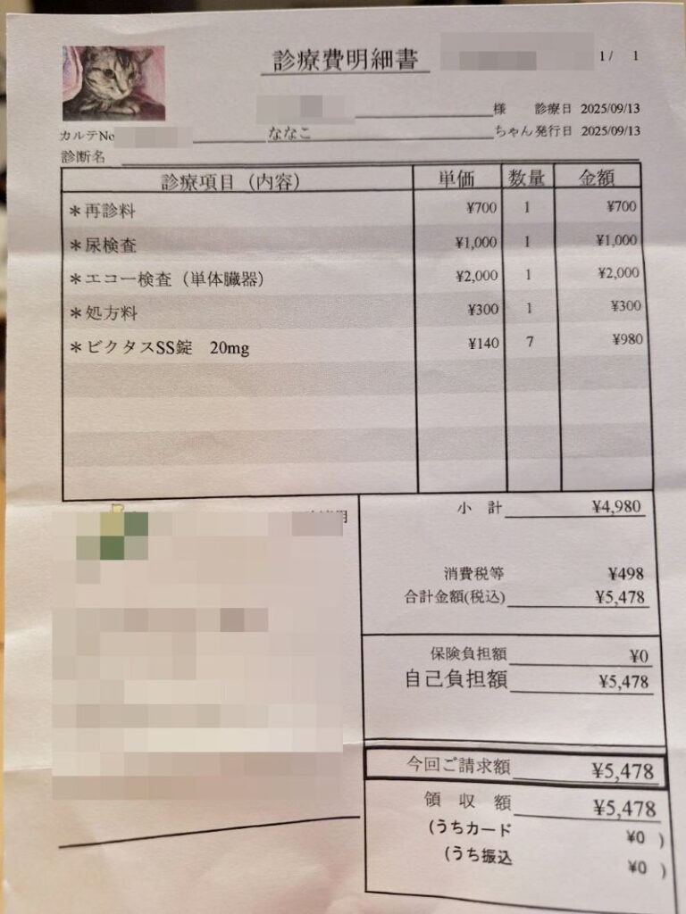 猫の膀胱炎の診察・検査・治療にかかった費用【領収書の金額公開】